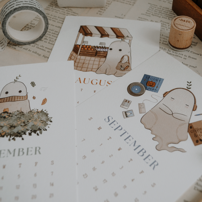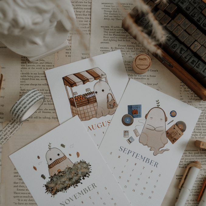 2026 calendar cards featuring illustration of Cello, my original character! Each month features a look into the life of a coffee-loving ghost.